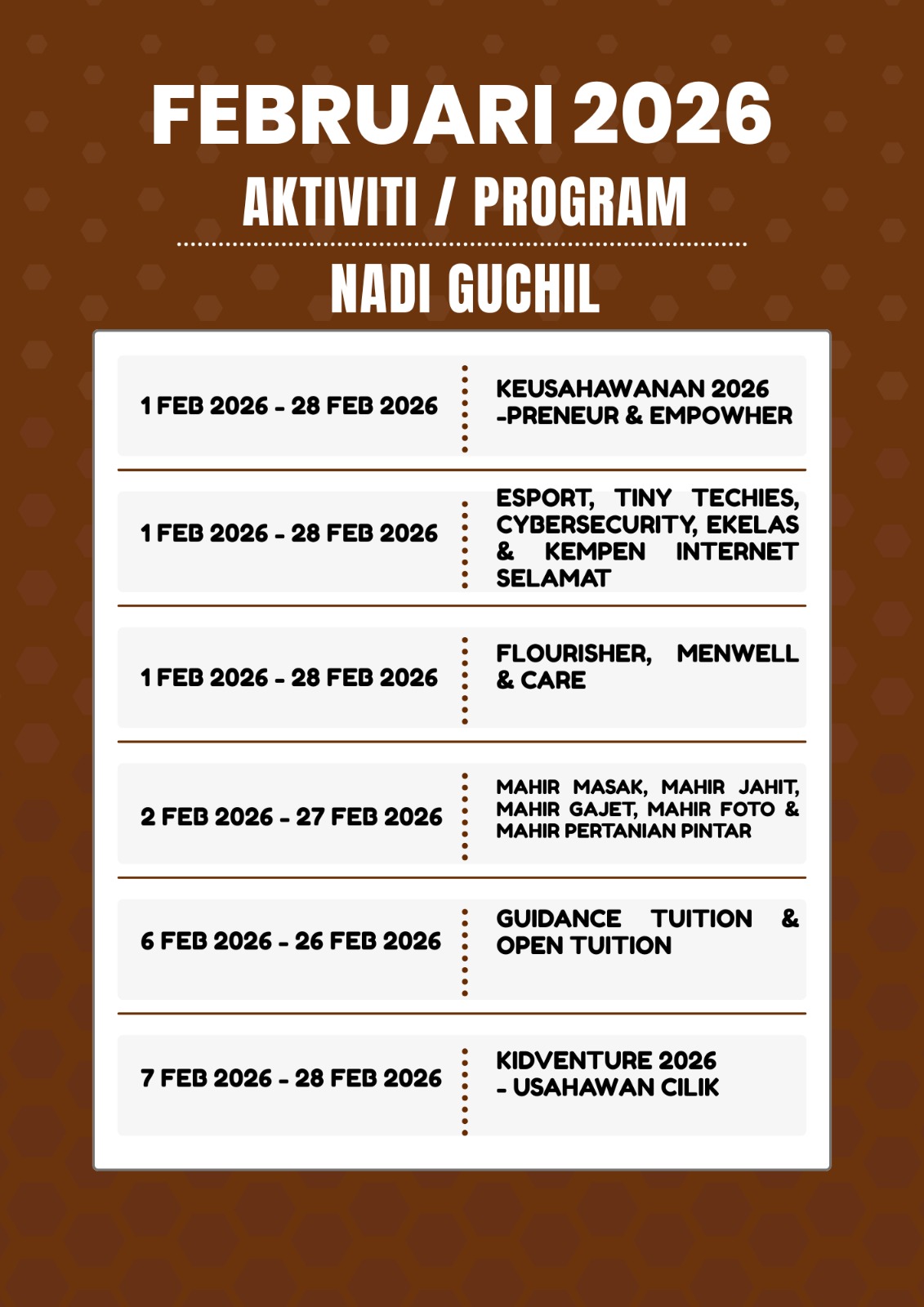 Tarikh : 31 Januari 2026 Masa : 3.00 petang – 4.00 petang Lokasi : NADI Guchil